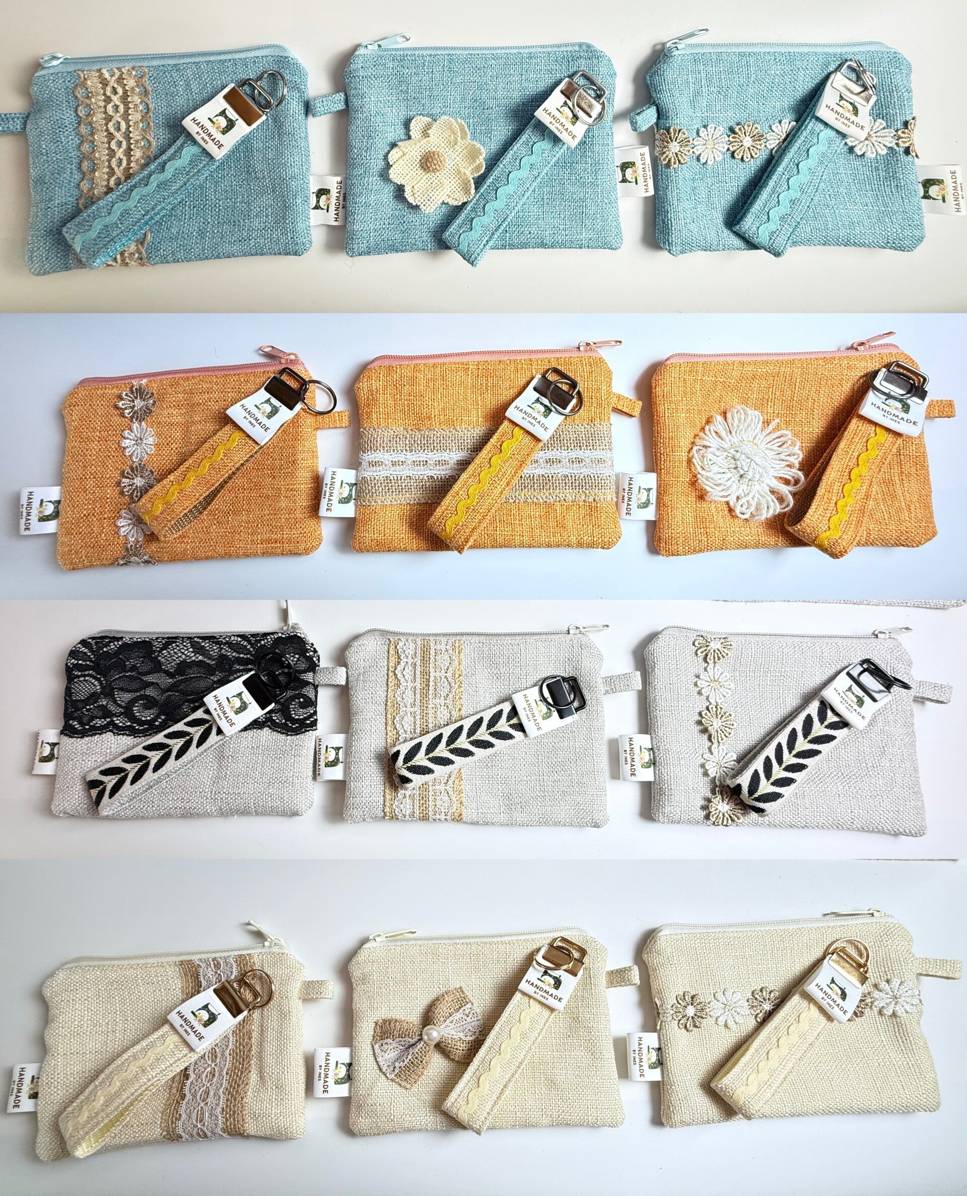 Jute-Taschen in 3 verschiedene Größen und 4 verschiedene Farben. Dabei sind die Schlüsselanhänger in Jute und Kosmetiktäschen ebenfalls in Jute.